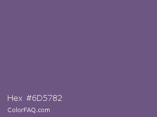 Hex #6d5782 Color is a normal purple color and the nearest color is Dolphin #646077. Hex code #6d5782 and RGB value is rgb(109,87,130). In RGB color space, this color is composed of 43% red, 34% green, 51% blue, In CMYK color space, this color is composed of 16% cyan, 33% magenta, 0% yellow , 49% black , In HSL color space, this color has a hue angle of 271° , 20% saturation and 43% lightness.