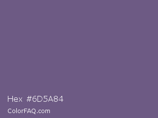 Hex #6d5a84 Color is a normal violet color and the nearest color is Dolphin #646077. Hex code #6d5a84 and RGB value is rgb(109,90,132). In RGB color space, this color is composed of 43% red, 35% green, 52% blue, In CMYK color space, this color is composed of 17% cyan, 32% magenta, 0% yellow , 48% black , In HSL color space, this color has a hue angle of 267° , 19% saturation and 44% lightness.