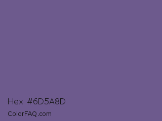 Hex #6d5a8d Color is a normal violet color and the nearest color is Dark Lavender #734f96. Hex code #6d5a8d and RGB value is rgb(109,90,141). In RGB color space, this color is composed of 43% red, 35% green, 55% blue, In CMYK color space, this color is composed of 23% cyan, 36% magenta, 0% yellow , 45% black , In HSL color space, this color has a hue angle of 262° , 22% saturation and 45% lightness.