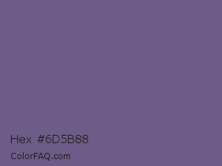 Hex #6d5b88 Color is a normal violet color and the nearest color is Rum #796989. Hex code #6d5b88 and RGB value is rgb(109,91,136). In RGB color space, this color is composed of 43% red, 36% green, 53% blue, In CMYK color space, this color is composed of 20% cyan, 33% magenta, 0% yellow , 47% black , In HSL color space, this color has a hue angle of 264° , 20% saturation and 45% lightness.