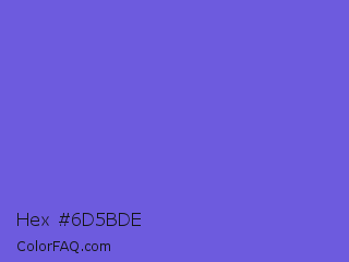 Hex #6d5bde Color is a light indigo color and the nearest color is Majorelle Blue #6050dc. Hex code #6d5bde and RGB value is rgb(109,91,222). In RGB color space, this color is composed of 43% red, 36% green, 87% blue, In CMYK color space, this color is composed of 51% cyan, 59% magenta, 0% yellow , 13% black , In HSL color space, this color has a hue angle of 248° , 66% saturation and 61% lightness.