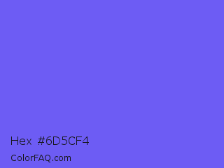Hex #6d5cf4 Color is a light indigo color and the nearest color is Very Light Blue #6666ff. Hex code #6d5cf4 and RGB value is rgb(109,92,244). In RGB color space, this color is composed of 43% red, 36% green, 96% blue, In CMYK color space, this color is composed of 55% cyan, 62% magenta, 0% yellow , 4% black , In HSL color space, this color has a hue angle of 247° , 87% saturation and 66% lightness.