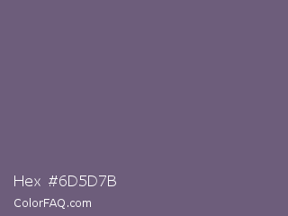 Hex #6d5d7b Color is a normal purple color and the nearest color is Dolphin #646077. Hex code #6d5d7b and RGB value is rgb(109,93,123). In RGB color space, this color is composed of 43% red, 36% green, 48% blue, In CMYK color space, this color is composed of 11% cyan, 24% magenta, 0% yellow , 52% black , In HSL color space, this color has a hue angle of 272° , 14% saturation and 42% lightness.