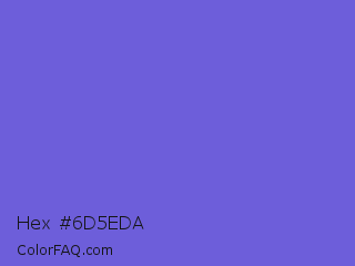 Hex #6d5eda Color is a light indigo color and the nearest color is Slate Blue #6a5acd. Hex code #6d5eda and RGB value is rgb(109,94,218). In RGB color space, this color is composed of 43% red, 37% green, 85% blue, In CMYK color space, this color is composed of 50% cyan, 57% magenta, 0% yellow , 15% black , In HSL color space, this color has a hue angle of 247° , 63% saturation and 61% lightness.