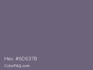 Hex #6d637b Color is a normal violet color and the nearest color is Dolphin #646077. Hex code #6d637b and RGB value is rgb(109,99,123). In RGB color space, this color is composed of 43% red, 39% green, 48% blue, In CMYK color space, this color is composed of 11% cyan, 20% magenta, 0% yellow , 52% black , In HSL color space, this color has a hue angle of 265° , 11% saturation and 44% lightness.