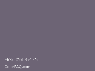 Hex #6d6475 Color is a normal purple color and the nearest color is Dolphin #646077. Hex code #6d6475 and RGB value is rgb(109,100,117). In RGB color space, this color is composed of 43% red, 39% green, 46% blue, In CMYK color space, this color is composed of 7% cyan, 15% magenta, 0% yellow , 54% black , In HSL color space, this color has a hue angle of 272° , 8% saturation and 43% lightness.