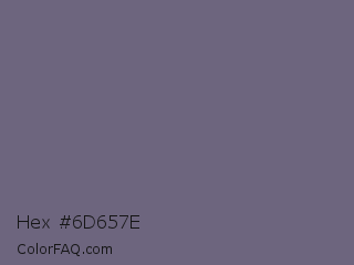 Hex #6d657e Color is a normal indigo color and the nearest color is Dolphin #646077. Hex code #6d657e and RGB value is rgb(109,101,126). In RGB color space, this color is composed of 43% red, 40% green, 49% blue, In CMYK color space, this color is composed of 13% cyan, 20% magenta, 0% yellow , 51% black , In HSL color space, this color has a hue angle of 259° , 11% saturation and 45% lightness.