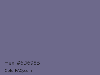 Hex #6d698b Color is a normal indigo color and the nearest color is Rum #796989. Hex code #6d698b and RGB value is rgb(109,105,139). In RGB color space, this color is composed of 43% red, 41% green, 55% blue, In CMYK color space, this color is composed of 22% cyan, 24% magenta, 0% yellow , 45% black , In HSL color space, this color has a hue angle of 247° , 14% saturation and 48% lightness.