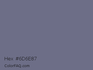 Hex #6d6e87 Color is a normal blue color and the nearest color is Storm Gray #717486. Hex code #6d6e87 and RGB value is rgb(109,110,135). In RGB color space, this color is composed of 43% red, 43% green, 53% blue, In CMYK color space, this color is composed of 19% cyan, 19% magenta, 0% yellow , 47% black , In HSL color space, this color has a hue angle of 238° , 11% saturation and 48% lightness.