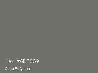 Hex #6d7069 Color is a normal green color and the nearest color is Dove Gray #6d6c6c. Hex code #6d7069 and RGB value is rgb(109,112,105). In RGB color space, this color is composed of 43% red, 44% green, 41% blue, In CMYK color space, this color is composed of 3% cyan, 0% magenta, 6% yellow , 56% black , In HSL color space, this color has a hue angle of 86° , 3% saturation and 43% lightness.