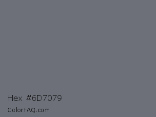 Hex #6d7079 Color is a normal blue color and the nearest color is Nickel #727472. Hex code #6d7079 and RGB value is rgb(109,112,121). In RGB color space, this color is composed of 43% red, 44% green, 47% blue, In CMYK color space, this color is composed of 10% cyan, 7% magenta, 0% yellow , 53% black , In HSL color space, this color has a hue angle of 225° , 5% saturation and 45% lightness.