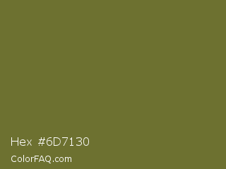 Hex #6d7130 Color is a normal yellow color and the nearest color is Crete #737829. Hex code #6d7130 and RGB value is rgb(109,113,48). In RGB color space, this color is composed of 43% red, 44% green, 19% blue, In CMYK color space, this color is composed of 4% cyan, 0% magenta, 58% yellow , 56% black , In HSL color space, this color has a hue angle of 64° , 40% saturation and 32% lightness.