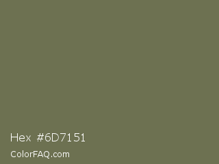 Hex #6d7151 Color is a normal yellow color and the nearest color is Go Ben #726d4e. Hex code #6d7151 and RGB value is rgb(109,113,81). In RGB color space, this color is composed of 43% red, 44% green, 32% blue, In CMYK color space, this color is composed of 4% cyan, 0% magenta, 28% yellow , 56% black , In HSL color space, this color has a hue angle of 68° , 16% saturation and 38% lightness.