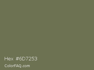 Hex #6d7253 Color is a normal yellow color and the nearest color is Kokoda #6e6d57. Hex code #6d7253 and RGB value is rgb(109,114,83). In RGB color space, this color is composed of 43% red, 45% green, 33% blue, In CMYK color space, this color is composed of 4% cyan, 0% magenta, 27% yellow , 55% black , In HSL color space, this color has a hue angle of 70° , 16% saturation and 39% lightness.