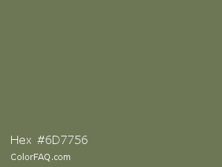 Hex #6d7756 Color is a normal lime color and the nearest color is Kokoda #6e6d57. Hex code #6d7756 and RGB value is rgb(109,119,86). In RGB color space, this color is composed of 43% red, 47% green, 34% blue, In CMYK color space, this color is composed of 8% cyan, 0% magenta, 28% yellow , 53% black , In HSL color space, this color has a hue angle of 78° , 16% saturation and 40% lightness.