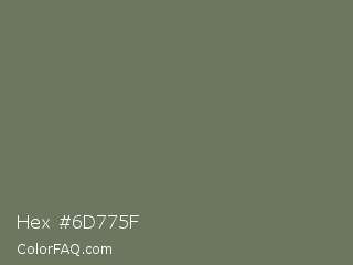 Hex #6d775f Color is a normal green color and the nearest color is Willow Grove #65745d. Hex code #6d775f and RGB value is rgb(109,119,95). In RGB color space, this color is composed of 43% red, 47% green, 37% blue, In CMYK color space, this color is composed of 8% cyan, 0% magenta, 20% yellow , 53% black , In HSL color space, this color has a hue angle of 85° , 11% saturation and 42% lightness.