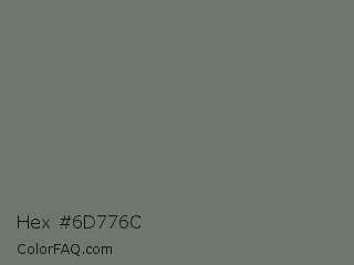 Hex #6d776c Color is a normal green color and the nearest color is Nickel #727472. Hex code #6d776c and RGB value is rgb(109,119,108). In RGB color space, this color is composed of 43% red, 47% green, 42% blue, In CMYK color space, this color is composed of 8% cyan, 0% magenta, 9% yellow , 53% black , In HSL color space, this color has a hue angle of 115° , 5% saturation and 45% lightness.