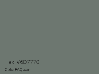 Hex #6d7770 Color is a normal green color and the nearest color is Nickel #727472. Hex code #6d7770 and RGB value is rgb(109,119,112). In RGB color space, this color is composed of 43% red, 47% green, 44% blue, In CMYK color space, this color is composed of 8% cyan, 0% magenta, 6% yellow , 53% black , In HSL color space, this color has a hue angle of 138° , 4% saturation and 45% lightness.