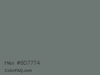 Hex #6d7774 Color is a normal green color and the nearest color is Nickel #727472. Hex code #6d7774 and RGB value is rgb(109,119,116). In RGB color space, this color is composed of 43% red, 47% green, 45% blue, In CMYK color space, this color is composed of 8% cyan, 0% magenta, 3% yellow , 53% black , In HSL color space, this color has a hue angle of 162° , 4% saturation and 45% lightness.