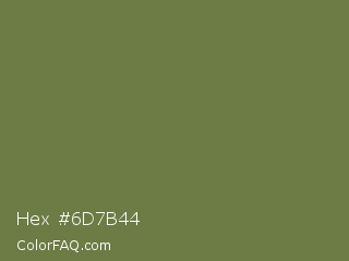 Hex #6d7b44 Color is a normal lime color and the nearest color is Dingley #5d7747. Hex code #6d7b44 and RGB value is rgb(109,123,68). In RGB color space, this color is composed of 43% red, 48% green, 27% blue, In CMYK color space, this color is composed of 11% cyan, 0% magenta, 45% yellow , 52% black , In HSL color space, this color has a hue angle of 75° , 29% saturation and 37% lightness.
