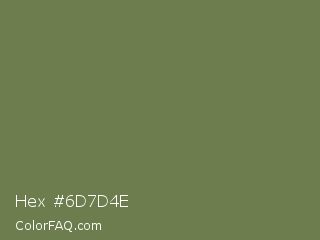 Hex #6d7d4e Color is a normal green color and the nearest color is Go Ben #726d4e. Hex code #6d7d4e and RGB value is rgb(109,125,78). In RGB color space, this color is composed of 43% red, 49% green, 31% blue, In CMYK color space, this color is composed of 13% cyan, 0% magenta, 38% yellow , 51% black , In HSL color space, this color has a hue angle of 80° , 23% saturation and 40% lightness.