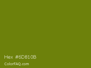 Hex #6d810b Color is a dark yellow color and the nearest color is Olivetone #716e10. Hex code #6d810b and RGB value is rgb(109,129,11). In RGB color space, this color is composed of 43% red, 51% green, 4% blue, In CMYK color space, this color is composed of 16% cyan, 0% magenta, 91% yellow , 49% black , In HSL color space, this color has a hue angle of 70° , 84% saturation and 27% lightness.