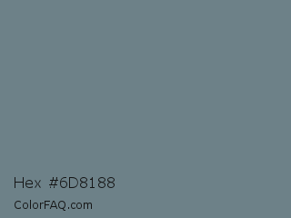 Hex #6d8188 Color is a normal blue color and the nearest color is Raven #727b89. Hex code #6d8188 and RGB value is rgb(109,129,136). In RGB color space, this color is composed of 43% red, 51% green, 53% blue, In CMYK color space, this color is composed of 20% cyan, 5% magenta, 0% yellow , 47% black , In HSL color space, this color has a hue angle of 196° , 11% saturation and 48% lightness.