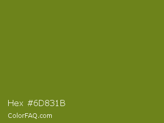 Hex #6d831b Color is a normal lime color and the nearest color is Pacifika #778120. Hex code #6d831b and RGB value is rgb(109,131,27). In RGB color space, this color is composed of 43% red, 51% green, 11% blue, In CMYK color space, this color is composed of 17% cyan, 0% magenta, 79% yellow , 49% black , In HSL color space, this color has a hue angle of 73° , 66% saturation and 31% lightness.