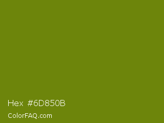 Hex #6d850b Color is a dark lime color and the nearest color is Trendy Green #7c881a. Hex code #6d850b and RGB value is rgb(109,133,11). In RGB color space, this color is composed of 43% red, 52% green, 4% blue, In CMYK color space, this color is composed of 18% cyan, 0% magenta, 92% yellow , 48% black , In HSL color space, this color has a hue angle of 72° , 85% saturation and 28% lightness.