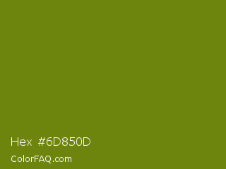 Hex #6d850d Color is a dark lime color and the nearest color is Trendy Green #7c881a. Hex code #6d850d and RGB value is rgb(109,133,13). In RGB color space, this color is composed of 43% red, 52% green, 5% blue, In CMYK color space, this color is composed of 18% cyan, 0% magenta, 90% yellow , 48% black , In HSL color space, this color has a hue angle of 72° , 82% saturation and 29% lightness.