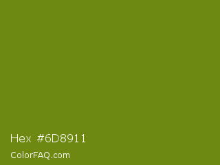 Hex #6d8911 Color is a dark lime color and the nearest color is Trendy Green #7c881a. Hex code #6d8911 and RGB value is rgb(109,137,17). In RGB color space, this color is composed of 43% red, 54% green, 7% blue, In CMYK color space, this color is composed of 20% cyan, 0% magenta, 88% yellow , 46% black , In HSL color space, this color has a hue angle of 74° , 78% saturation and 30% lightness.
