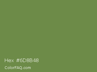Hex #6d8b48 Color is a normal green color and the nearest color is Palm Leaf #6f9940. Hex code #6d8b48 and RGB value is rgb(109,139,72). In RGB color space, this color is composed of 43% red, 55% green, 28% blue, In CMYK color space, this color is composed of 22% cyan, 0% magenta, 48% yellow , 45% black , In HSL color space, this color has a hue angle of 87° , 32% saturation and 41% lightness.