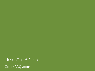 Hex #6d913b Color is a normal green color and the nearest color is Palm Leaf #6f9940. Hex code #6d913b and RGB value is rgb(109,145,59). In RGB color space, this color is composed of 43% red, 57% green, 23% blue, In CMYK color space, this color is composed of 25% cyan, 0% magenta, 59% yellow , 43% black , In HSL color space, this color has a hue angle of 85° , 42% saturation and 40% lightness.