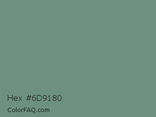 Hex #6d9180 Color is a normal green color and the nearest color is Laurel #749378. Hex code #6d9180 and RGB value is rgb(109,145,128). In RGB color space, this color is composed of 43% red, 57% green, 50% blue, In CMYK color space, this color is composed of 25% cyan, 0% magenta, 12% yellow , 43% black , In HSL color space, this color has a hue angle of 152° , 14% saturation and 50% lightness.