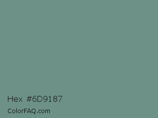 Hex #6d9187 Color is a normal green color and the nearest color is Juniper #6d9292. Hex code #6d9187 and RGB value is rgb(109,145,135). In RGB color space, this color is composed of 43% red, 57% green, 53% blue, In CMYK color space, this color is composed of 25% cyan, 0% magenta, 7% yellow , 43% black , In HSL color space, this color has a hue angle of 163° , 14% saturation and 50% lightness.