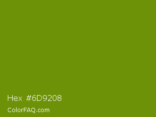 Hex #6d9208 Color is a dark lime color and the nearest color is Limeade #6f9d02. Hex code #6d9208 and RGB value is rgb(109,146,8). In RGB color space, this color is composed of 43% red, 57% green, 3% blue, In CMYK color space, this color is composed of 25% cyan, 0% magenta, 95% yellow , 43% black , In HSL color space, this color has a hue angle of 76° , 90% saturation and 30% lightness.