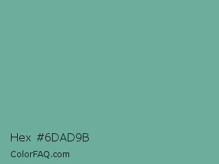 Hex #6dad9b Color is a normal green color and the nearest color is Green Sheen #6eaea1. Hex code #6dad9b and RGB value is rgb(109,173,155). In RGB color space, this color is composed of 43% red, 68% green, 61% blue, In CMYK color space, this color is composed of 37% cyan, 0% magenta, 10% yellow , 32% black , In HSL color space, this color has a hue angle of 163° , 28% saturation and 55% lightness.