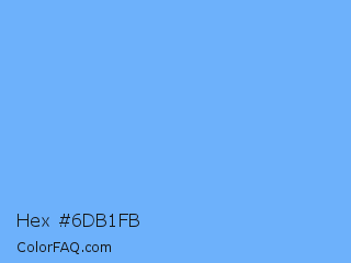 Hex #6db1fb Color is a light blue color and the nearest color is French Sky Blue #77b5fe. Hex code #6db1fb and RGB value is rgb(109,177,251). In RGB color space, this color is composed of 43% red, 69% green, 98% blue, In CMYK color space, this color is composed of 57% cyan, 29% magenta, 0% yellow , 2% black , In HSL color space, this color has a hue angle of 211° , 95% saturation and 71% lightness.