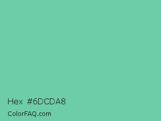 Hex #6dcda8 Color is a light green color and the nearest color is Medium Aquamarine #66ddaa. Hex code #6dcda8 and RGB value is rgb(109,205,168). In RGB color space, this color is composed of 43% red, 80% green, 66% blue, In CMYK color space, this color is composed of 47% cyan, 0% magenta, 18% yellow , 20% black , In HSL color space, this color has a hue angle of 157° , 49% saturation and 62% lightness.