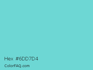 Hex #6dd7d4 Color is a light cyan color and the nearest color is Aquamarine Blue #71d9e2. Hex code #6dd7d4 and RGB value is rgb(109,215,212). In RGB color space, this color is composed of 43% red, 84% green, 83% blue, In CMYK color space, this color is composed of 49% cyan, 0% magenta, 1% yellow , 16% black , In HSL color space, this color has a hue angle of 178° , 57% saturation and 64% lightness.