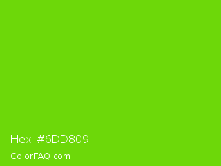 Hex #6dd809 Color is a normal green color and the nearest color is Alien Armpit #84de02. Hex code #6dd809 and RGB value is rgb(109,216,9). In RGB color space, this color is composed of 43% red, 85% green, 4% blue, In CMYK color space, this color is composed of 50% cyan, 0% magenta, 96% yellow , 15% black , In HSL color space, this color has a hue angle of 91° , 92% saturation and 44% lightness.