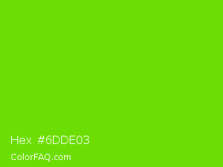Hex #6dde03 Color is a normal green color and the nearest color is Alien Armpit #84de02. Hex code #6dde03 and RGB value is rgb(109,222,3). In RGB color space, this color is composed of 43% red, 87% green, 1% blue, In CMYK color space, this color is composed of 51% cyan, 0% magenta, 99% yellow , 13% black , In HSL color space, this color has a hue angle of 91° , 97% saturation and 44% lightness.