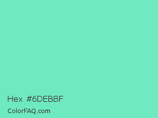 Hex #6debbf Color is a light green color and the nearest color is Bermuda #7dd8c6. Hex code #6debbf and RGB value is rgb(109,235,191). In RGB color space, this color is composed of 43% red, 92% green, 75% blue, In CMYK color space, this color is composed of 54% cyan, 0% magenta, 19% yellow , 8% black , In HSL color space, this color has a hue angle of 159° , 76% saturation and 67% lightness.