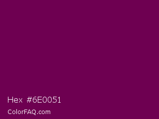 Hex #6e0051 Color is a very dark magenta color and the nearest color is Pompadour #660045. Hex code #6e0051 and RGB value is rgb(110,0,81). In RGB color space, this color is composed of 43% red, 0% green, 32% blue, In CMYK color space, this color is composed of 0% cyan, 100% magenta, 26% yellow , 57% black , In HSL color space, this color has a hue angle of 316° , 100% saturation and 22% lightness.