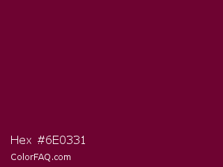 Hex #6e0331 Color is a very dark rose color and the nearest color is Black Rose #67032d. Hex code #6e0331 and RGB value is rgb(110,3,49). In RGB color space, this color is composed of 43% red, 1% green, 19% blue, In CMYK color space, this color is composed of 0% cyan, 97% magenta, 55% yellow , 57% black , In HSL color space, this color has a hue angle of 334° , 95% saturation and 22% lightness.