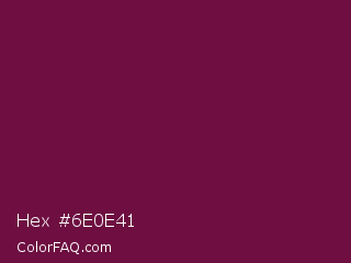 Hex #6e0e41 Color is a dark rose color and the nearest color is Tyrian Purple #66023c. Hex code #6e0e41 and RGB value is rgb(110,14,65). In RGB color space, this color is composed of 43% red, 5% green, 25% blue, In CMYK color space, this color is composed of 0% cyan, 87% magenta, 41% yellow , 57% black , In HSL color space, this color has a hue angle of 328° , 77% saturation and 24% lightness.
