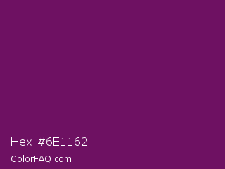 Hex #6e1162 Color is a dark magenta color and the nearest color is Palatinate Purple #682860. Hex code #6e1162 and RGB value is rgb(110,17,98). In RGB color space, this color is composed of 43% red, 7% green, 38% blue, In CMYK color space, this color is composed of 0% cyan, 85% magenta, 11% yellow , 57% black , In HSL color space, this color has a hue angle of 308° , 73% saturation and 25% lightness.