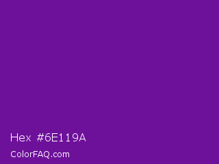 Hex #6e119a Color is a normal purple color and the nearest color is Seance #731e8f. Hex code #6e119a and RGB value is rgb(110,17,154). In RGB color space, this color is composed of 43% red, 7% green, 60% blue, In CMYK color space, this color is composed of 29% cyan, 89% magenta, 0% yellow , 40% black , In HSL color space, this color has a hue angle of 281° , 80% saturation and 34% lightness.
