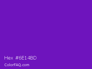 Hex #6e14bd Color is a normal purple color and the nearest color is Purple Heart Crayola #652dc1. Hex code #6e14bd and RGB value is rgb(110,20,189). In RGB color space, this color is composed of 43% red, 8% green, 74% blue, In CMYK color space, this color is composed of 42% cyan, 89% magenta, 0% yellow , 26% black , In HSL color space, this color has a hue angle of 272° , 81% saturation and 41% lightness.