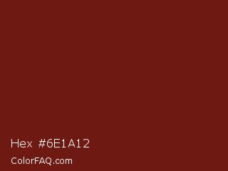 Hex #6e1a12 Color is a dark red color and the nearest color is Moccaccino #6e1d14. Hex code #6e1a12 and RGB value is rgb(110,26,18). In RGB color space, this color is composed of 43% red, 10% green, 7% blue, In CMYK color space, this color is composed of 0% cyan, 76% magenta, 84% yellow , 57% black , In HSL color space, this color has a hue angle of 5° , 72% saturation and 25% lightness.